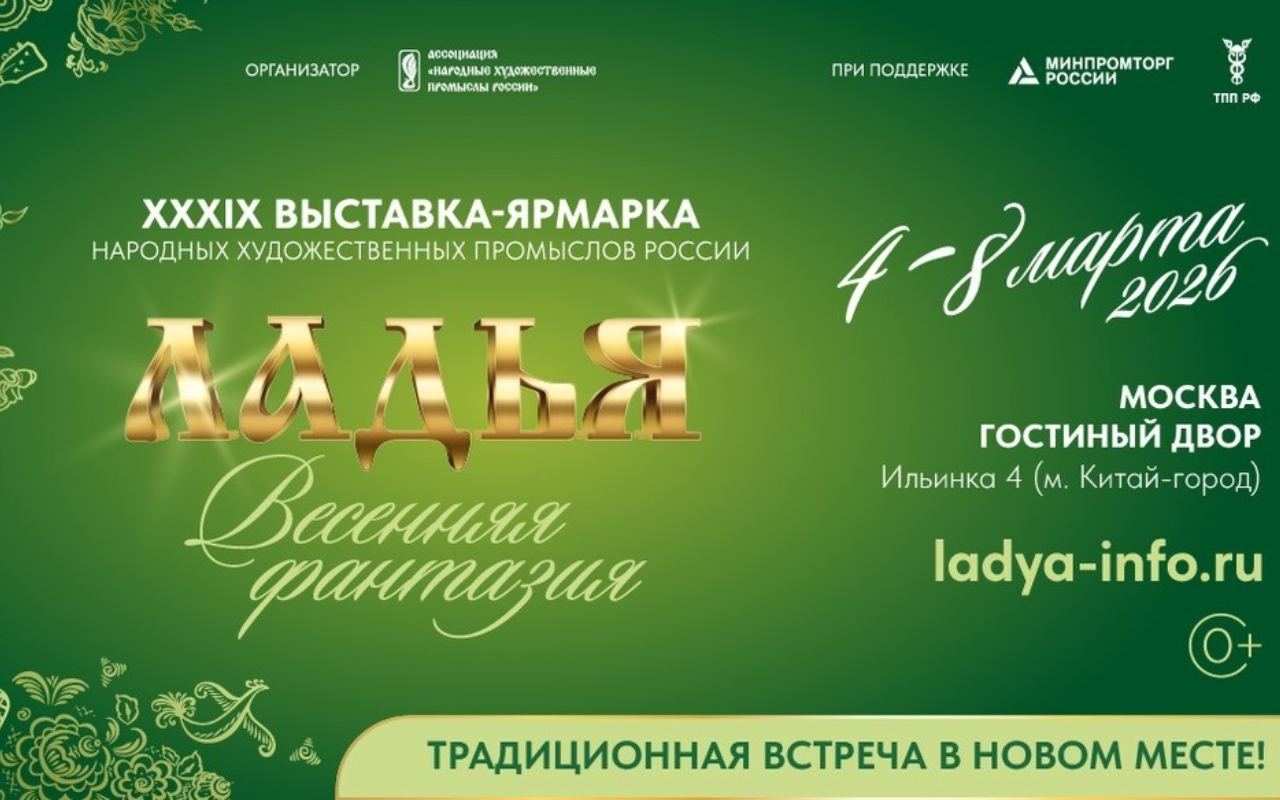 С 4 по 8 марта 2026 года в Москве, в ВЦ «Гостиный двор», прошла крупнейшая в России выставка-ярмарка народных художественных промыслов «ЛАДЬЯ. Весенняя фантазия-2026», организованная Ассоциацией «Народные художественные промыслы России» при поддержке Министерства промышленности и торговли РФ и Торгово-промышленной палаты РФ.